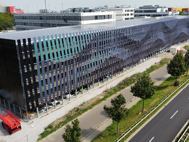 Ende Juni begann die Modulmontage an der Westfassade des Parkhauses, gefolgt von der Südfassade. Den Abschluss bildete die Montage der Ostfassade, einschließlich der Verkleidung des Süd-Treppenhauses am Aerologic-Gebäude. Am 22. August konnte dann die komplette Modul-Montage abgeschlossen werden. Insgesamt wurden an den Fassaden 2.032 schwarze und grüne SKALA-Module montiert. Trotz eines bauseitig hervorgerufenen verspäteten Montagebeginns von mehr als acht Wochen konnten wir die ursprünglich im Vertrag vereinbarten Termine einhalten.